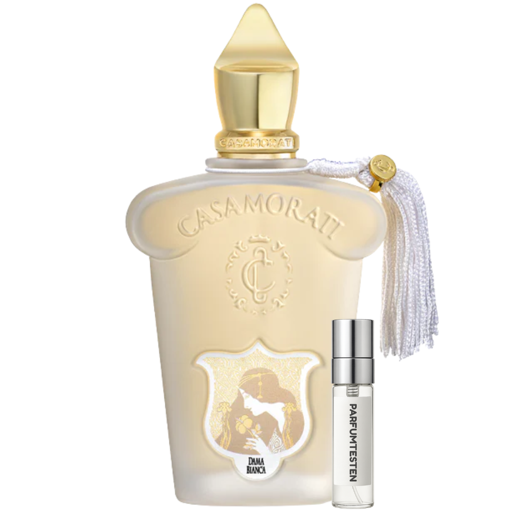 Xerjoff Casamorati – Dama Bianca ist ein sanfter, pudrig-vanilliger Duft mit Zitrusnoten, Veilchen, Iris, Vanille und Moschus. Er wirkt elegant, feminin und umhüllend. Jetzt als Parfümprobe testen.