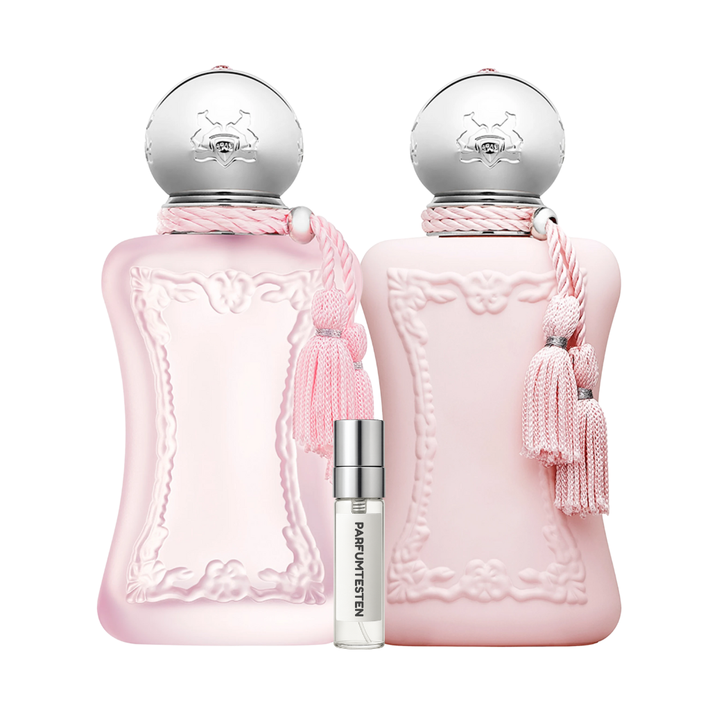 Das Parfums de Marly – Delina Proben-Bundle vereint zwei edle Varianten: Delina mit Rose, Litschi und Rhabarber sowie Delina La Rosée mit wässrigen Noten, Pfingstrose und sanftem Moschus. Ein feminines Duo von intensiv-fruchtig bis leicht-frisch. Jetzt als Parfümprobe testen.