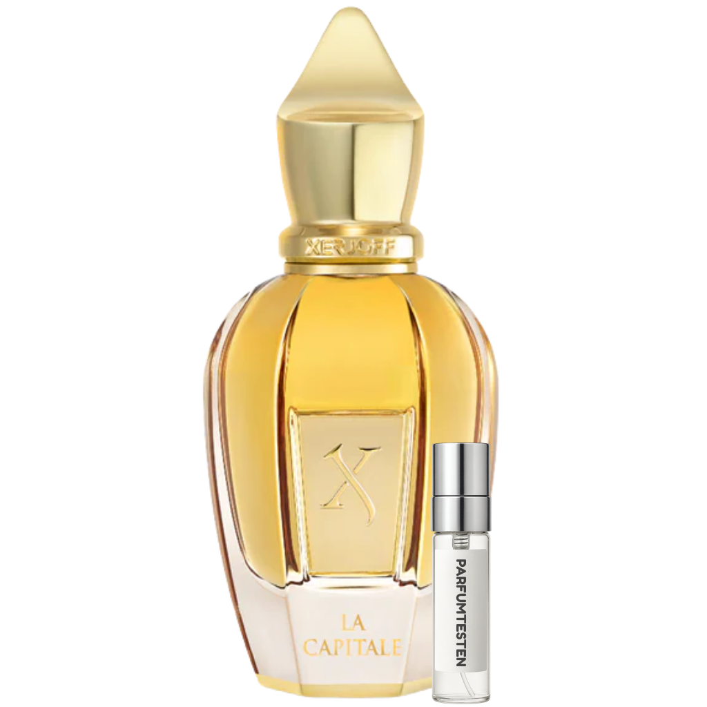 Xerjoff - La Capitale ist ein luxuriöser, gourmandig-fruchtiger Duft mit Erdbeere, Pfirsich, Amber, Karamell, Rose, Vanille und Leder. Er wirkt opulent, süß und verführerisch. Jetzt als Parfümprobe testen.